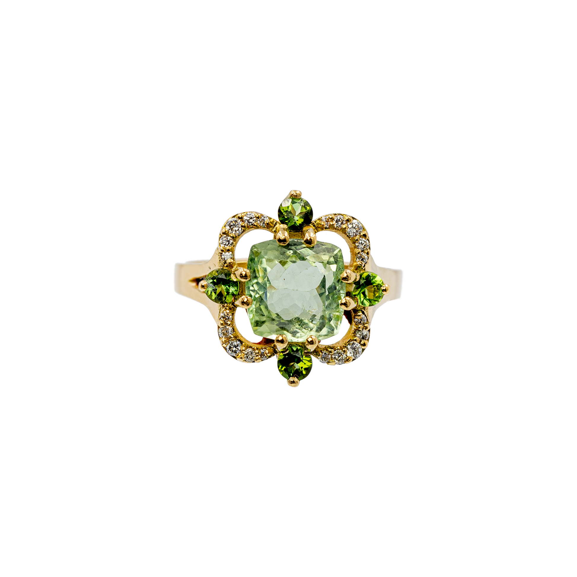 Anello Charleston in oro giallo 18kt con Prasiolite taglio cuscino 3,90ct 4 tormaline verdi da 0,44ct e diamanti taglio brillante 0,18ct