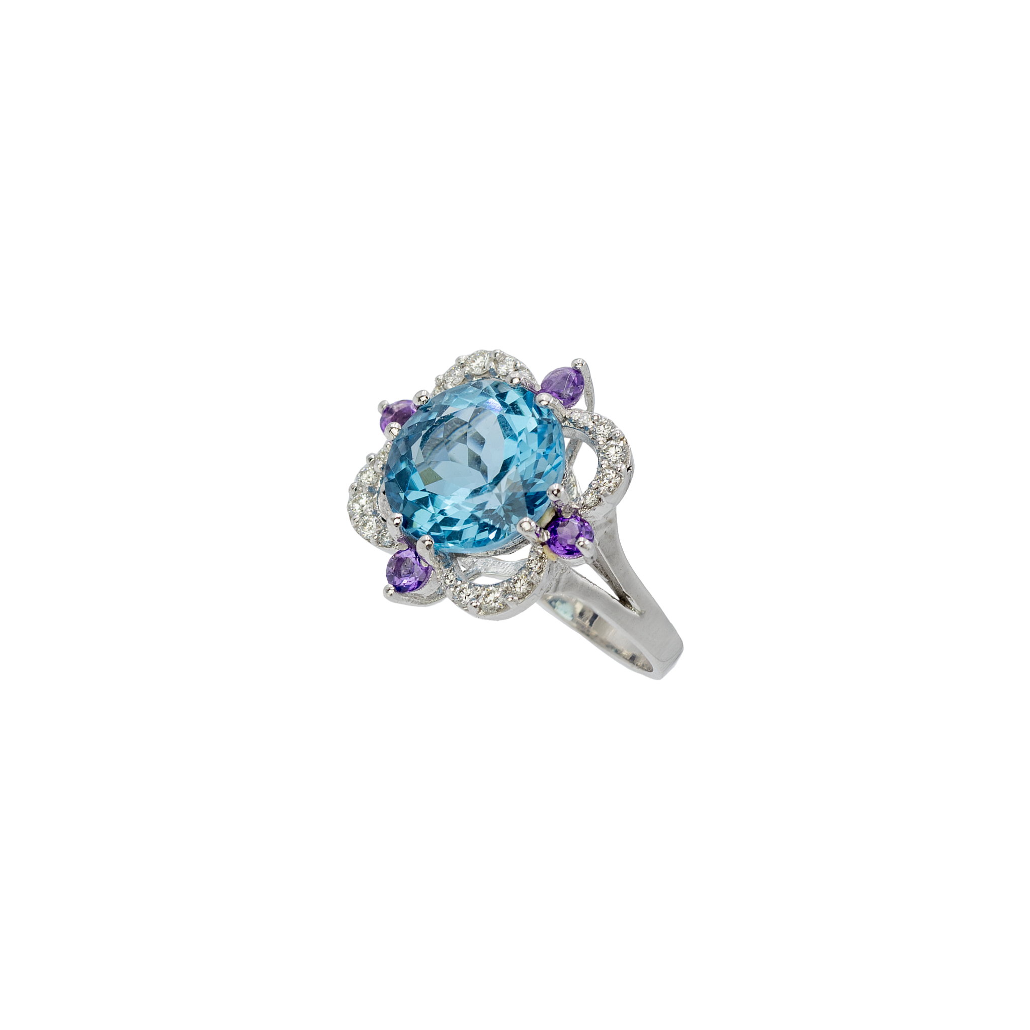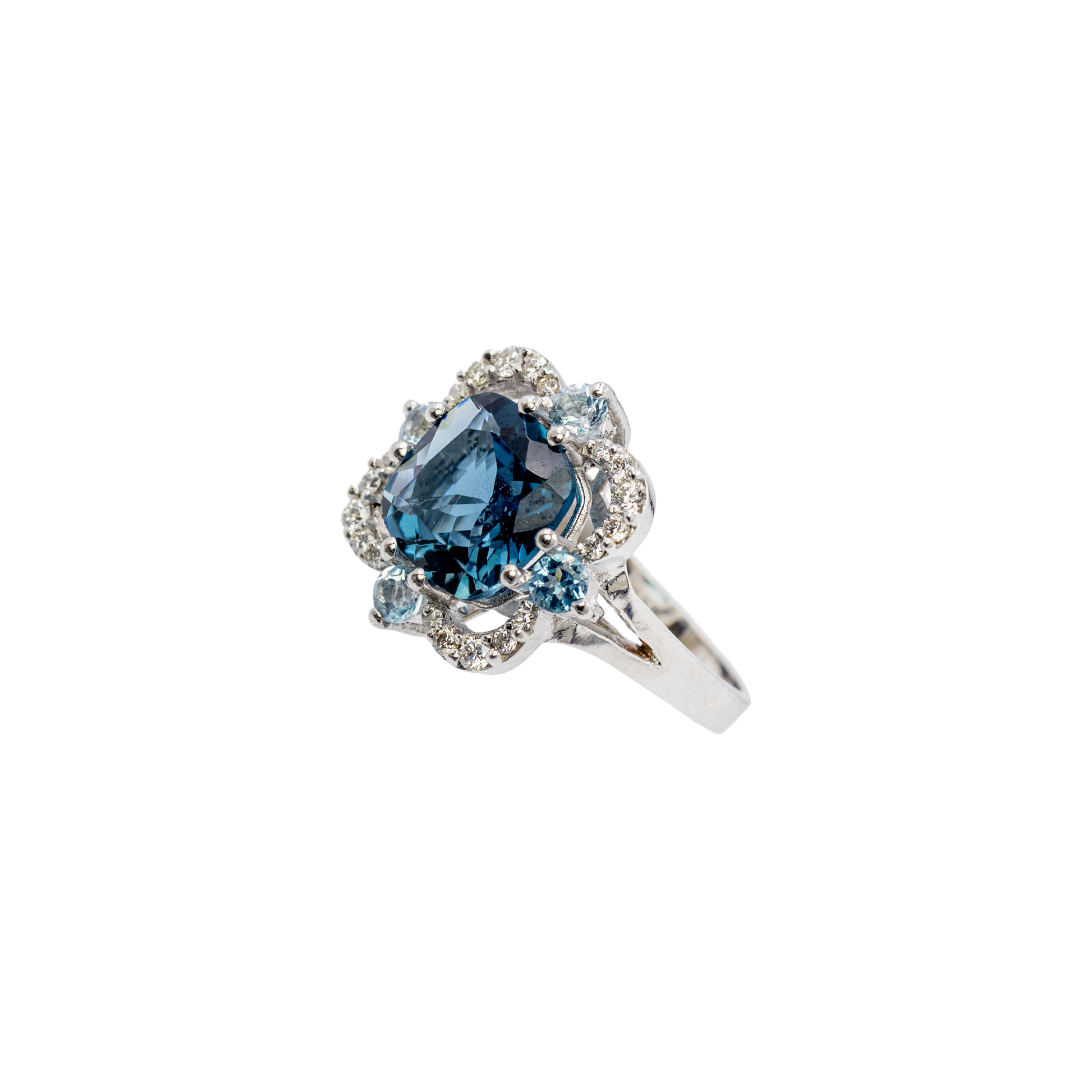 Anello Charleston in oro bianco 18kt con topazio blu london taglio cuscino 2,66ct 4 topazi azzurri da 0,44ct e diamanti taglio brillante 0,18ct