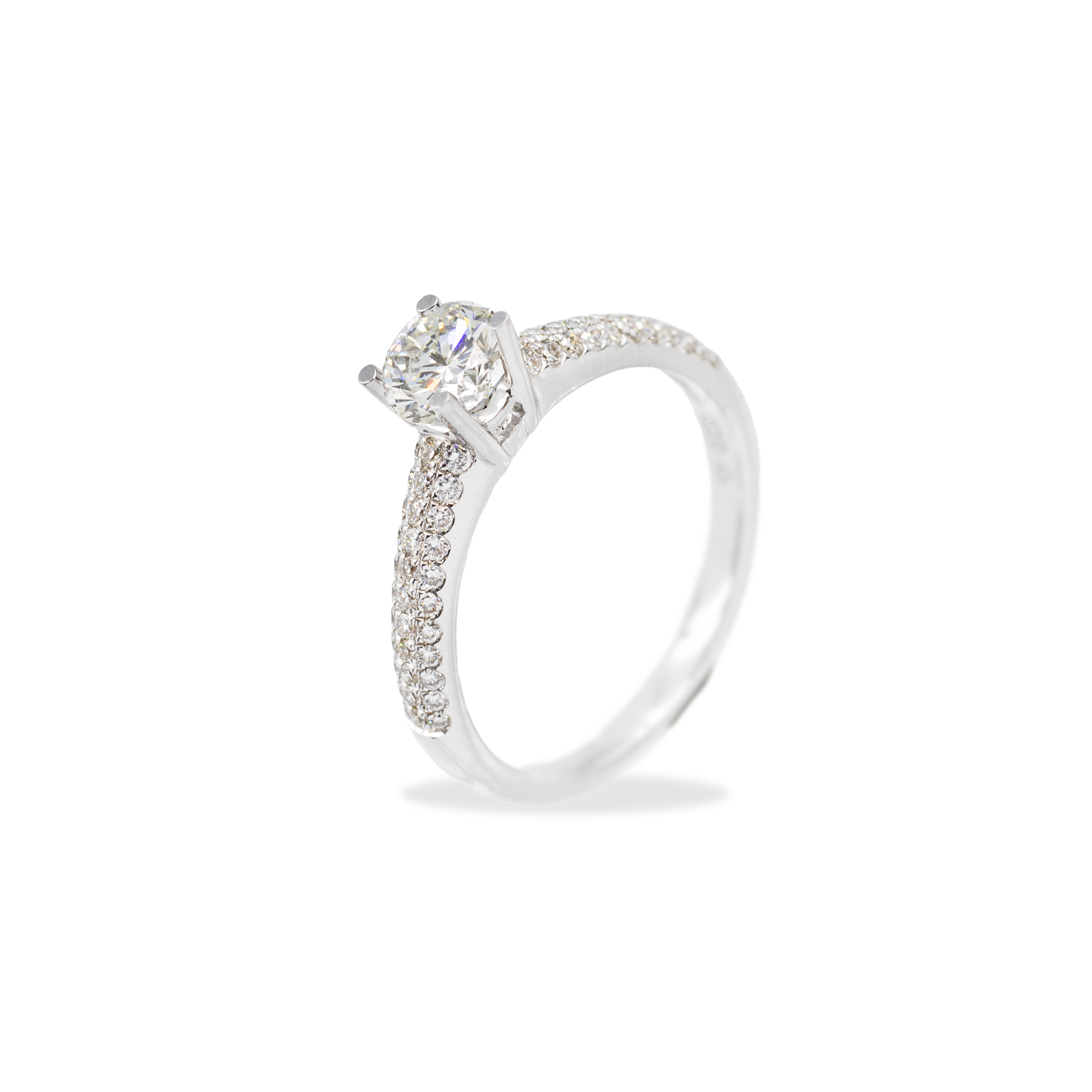 Anello Solitario in oro bianco 18kt a quattro griffe e diamanti ct.0,33 ai lati.