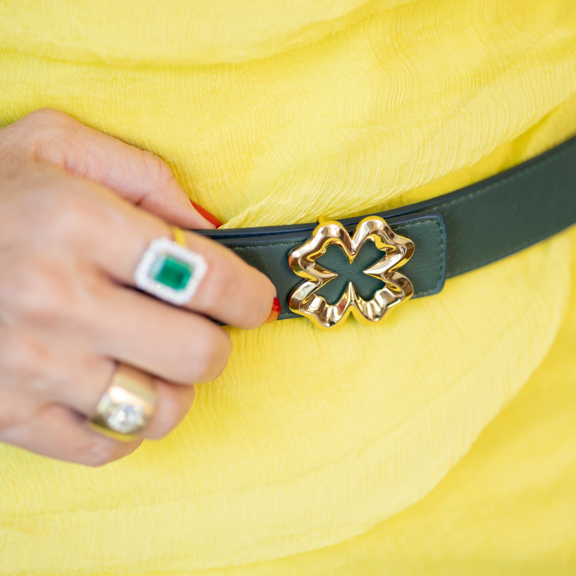 Cintura realizzata in pregiato pellame toscano made in Italy e impreziosita dal quadrifoglio portafortuna in acciaio con galvanica oro ad alto spessore.