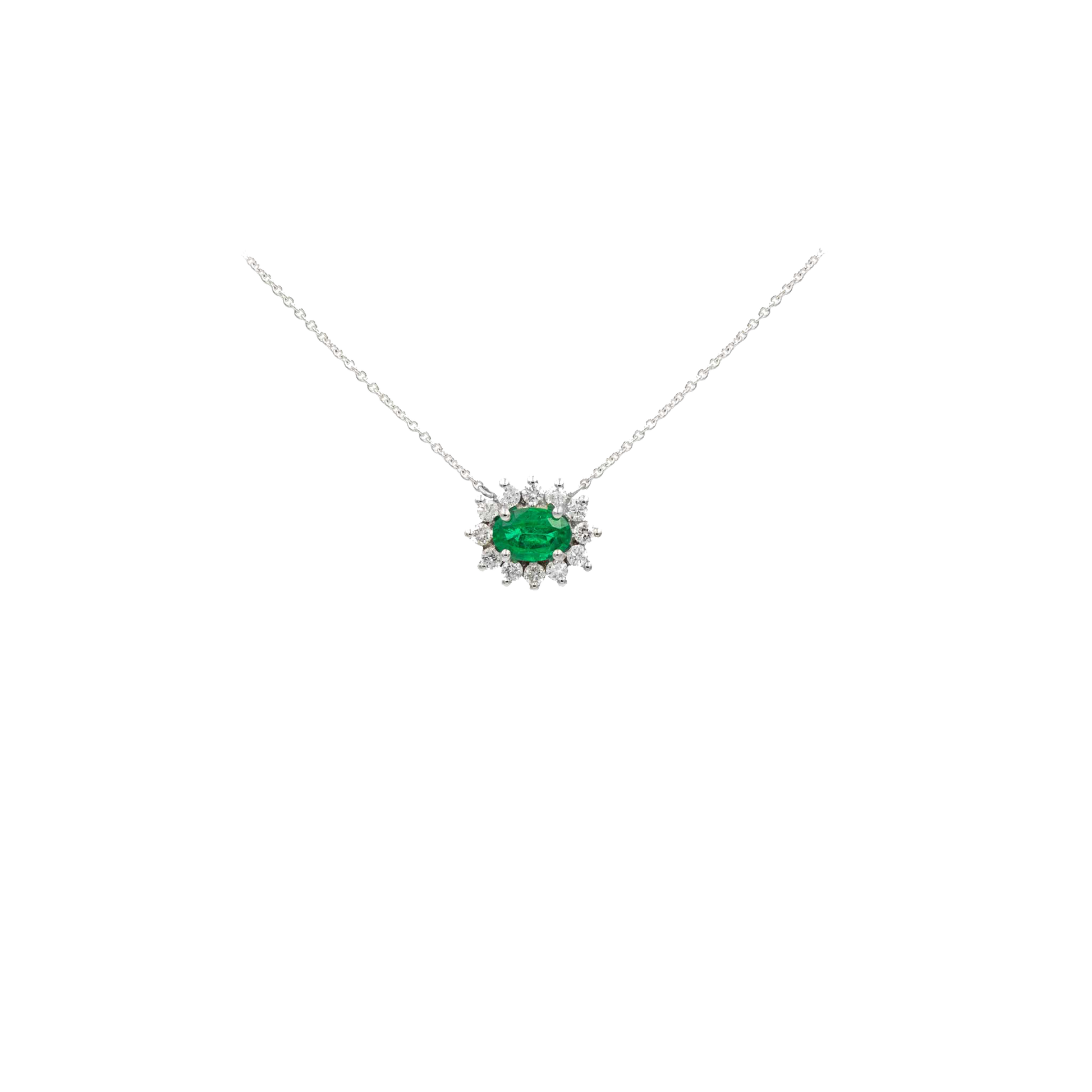 Collier Fleur in oro bianco 18kt con 10 Diamanti taglio brillante ct. 0,10 e Smeraldo ct. 0,15. Smeraldo ovale 4×3 mm