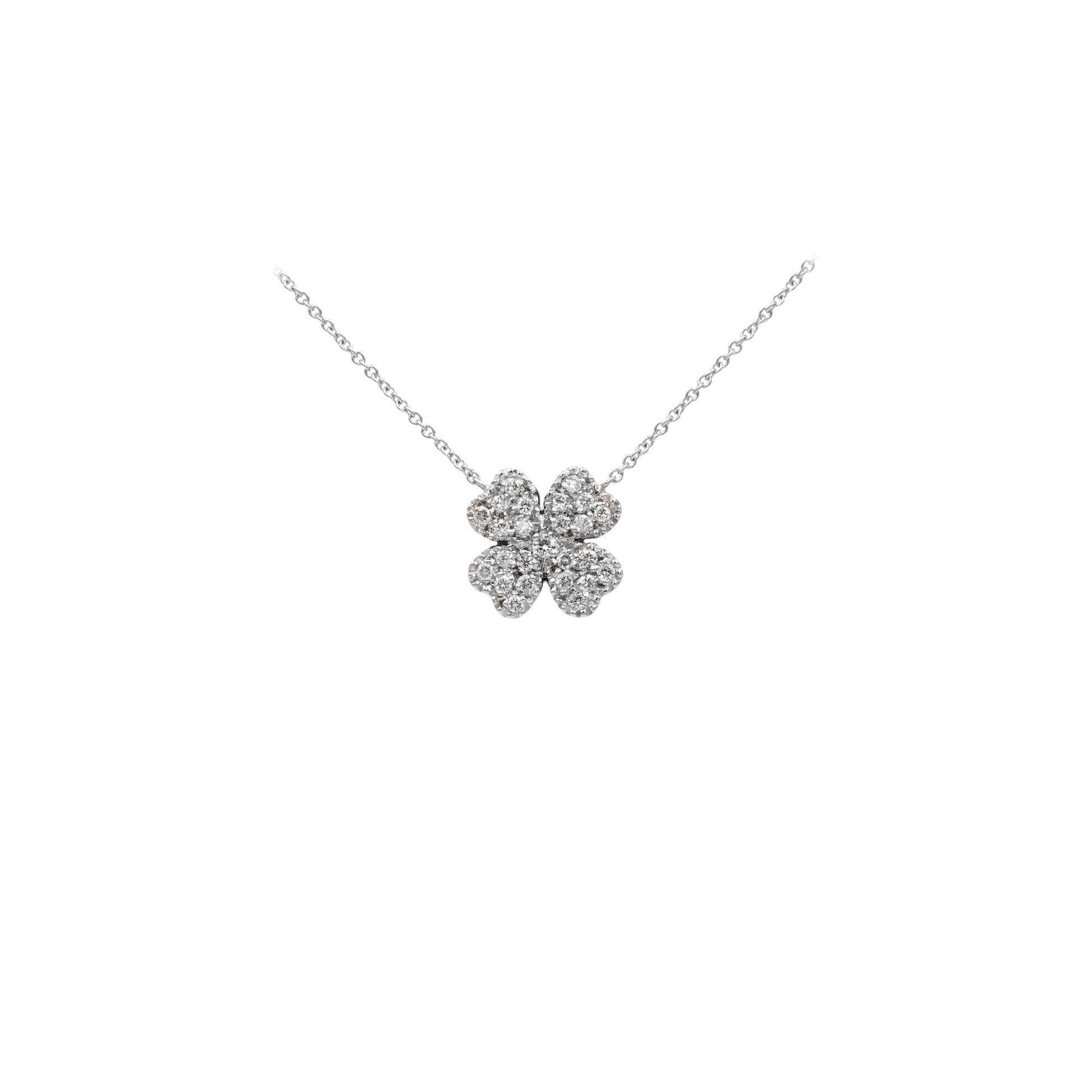 Collier Portafortuna con quadrifoglio in oro bianco 18ct e pavè di diamanti taglio brillante ct. 0.26.