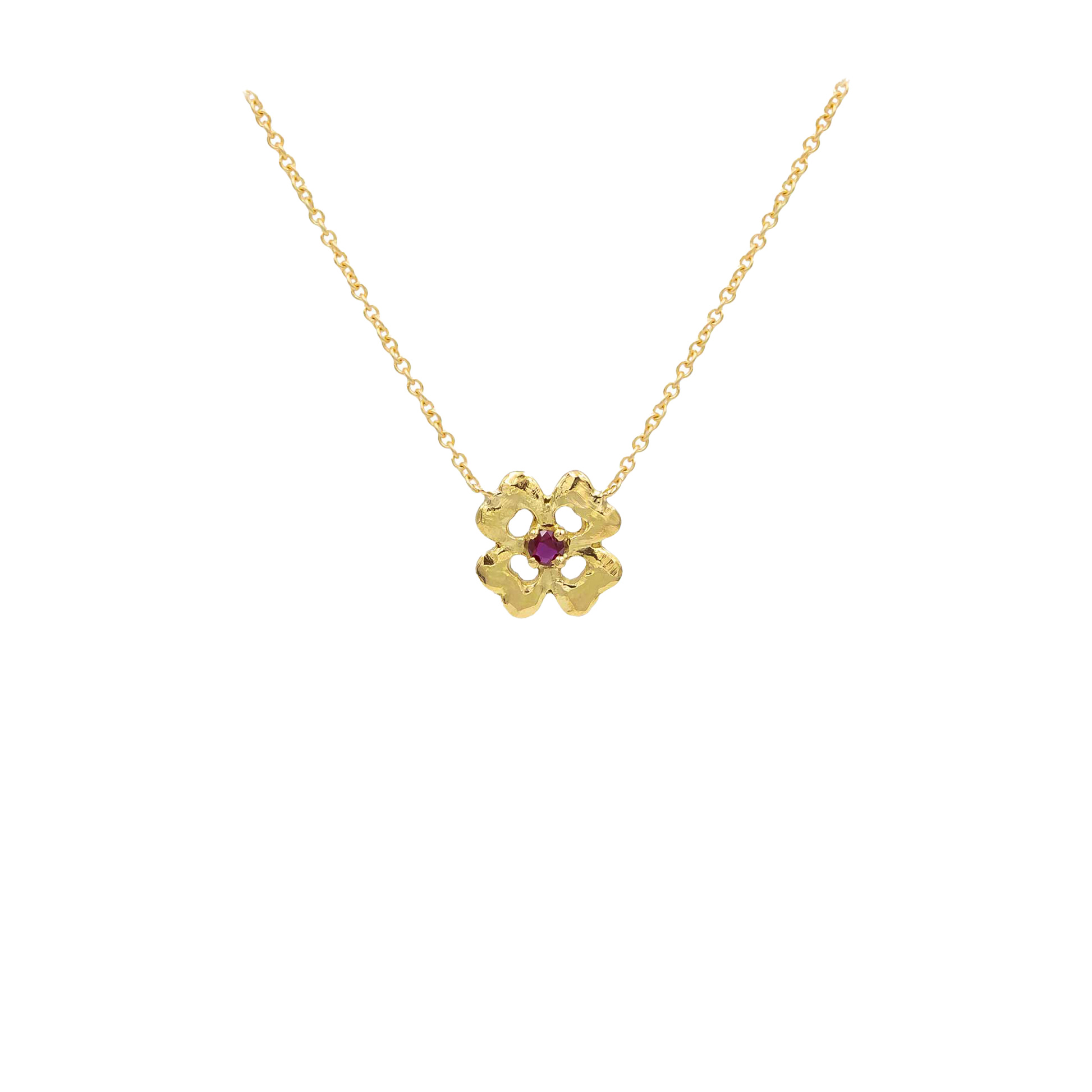 Collier Quadrifoglio Portafortuna in oro giallo 18kt Rubino taglio brillante ct. 0,10.