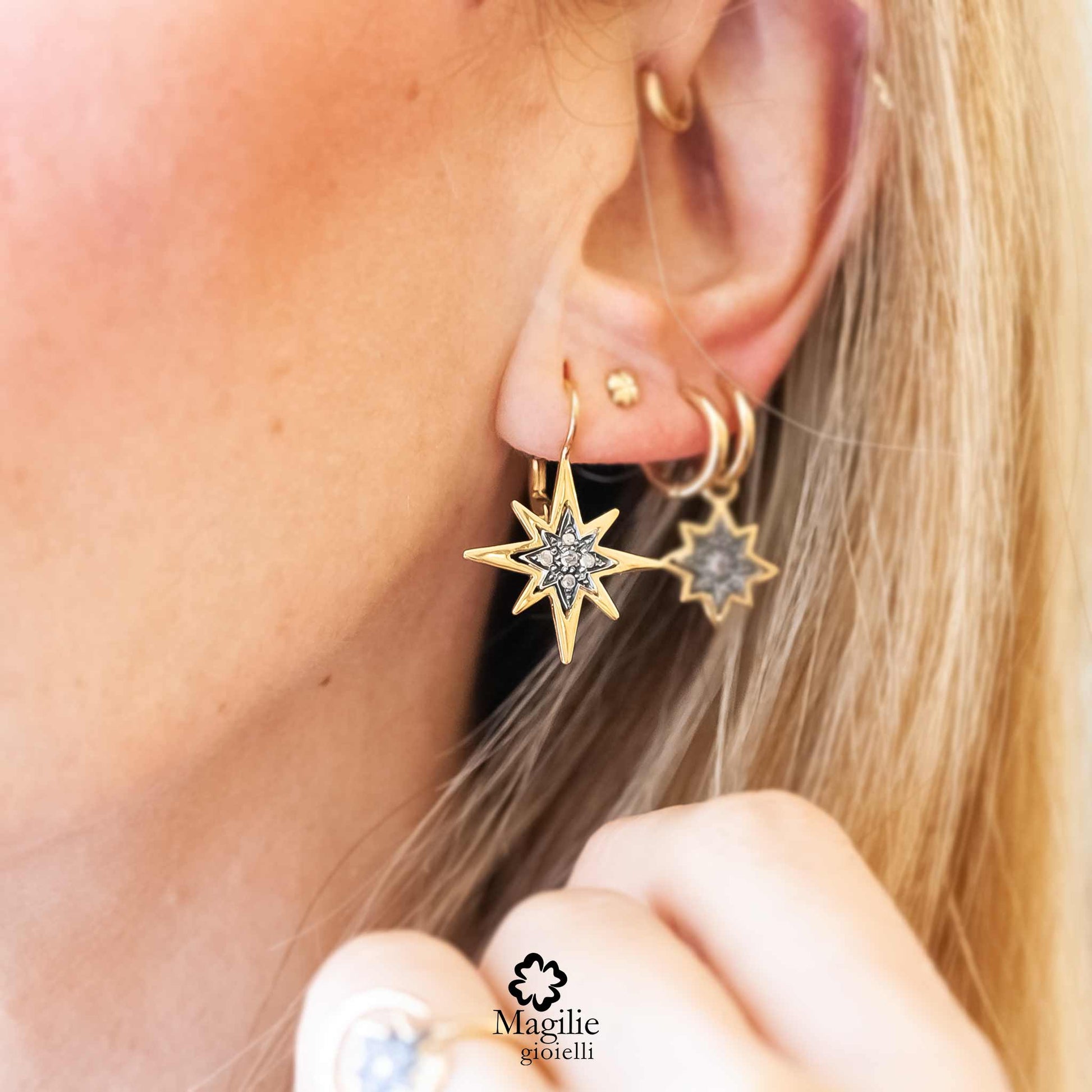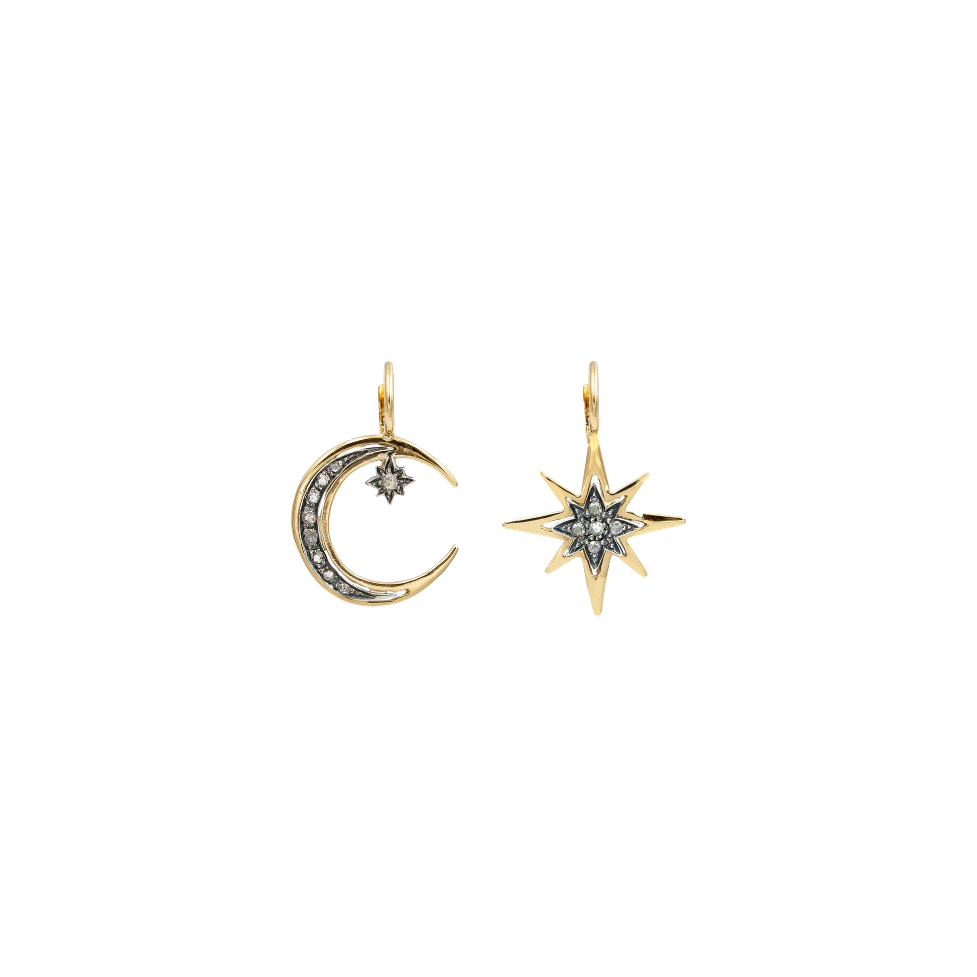 Orecchini Stella Luna Collezione Aurora in oro giallo 18ct e argento 925 brunito con Diamanti taglio Rosa Coroné ct. 0,16.