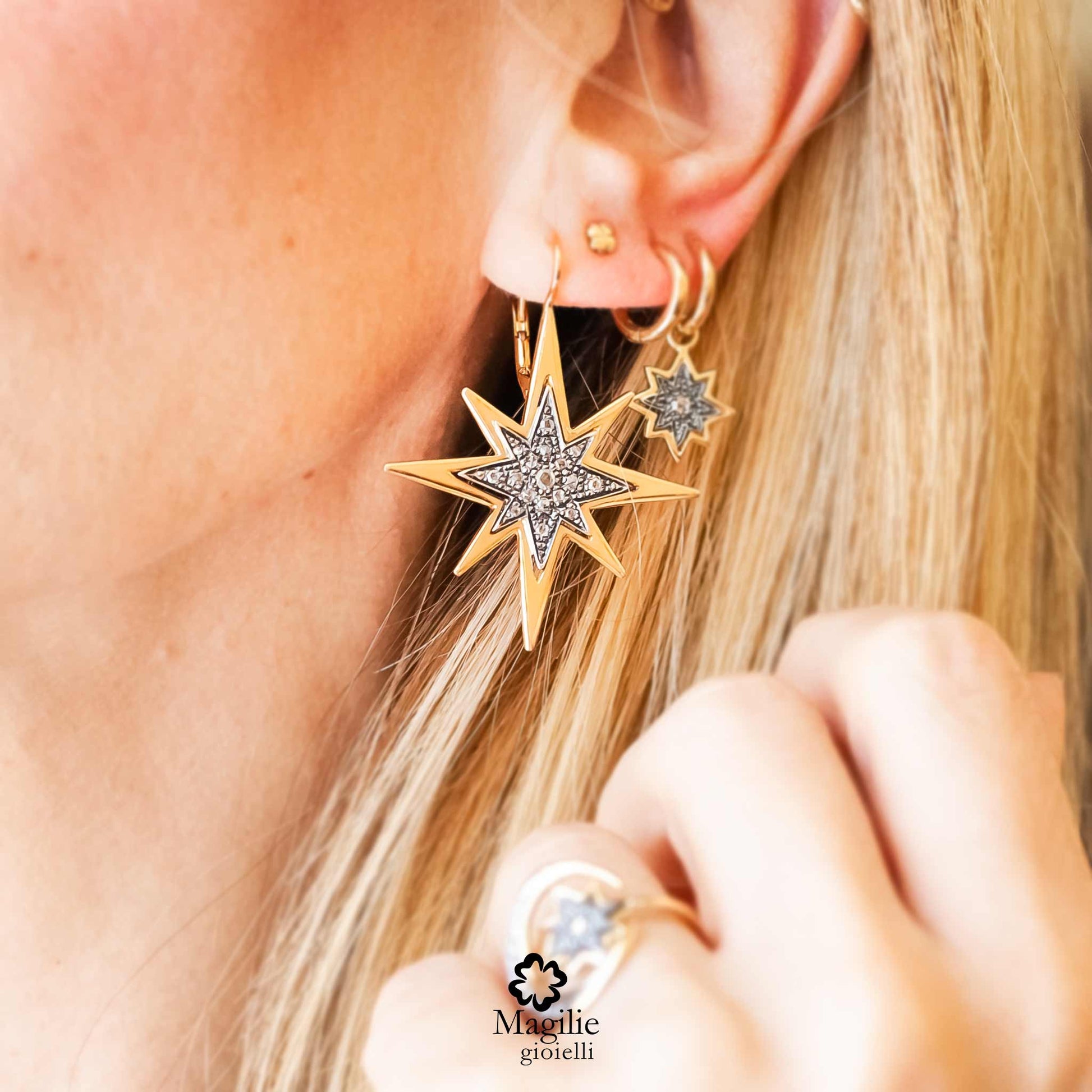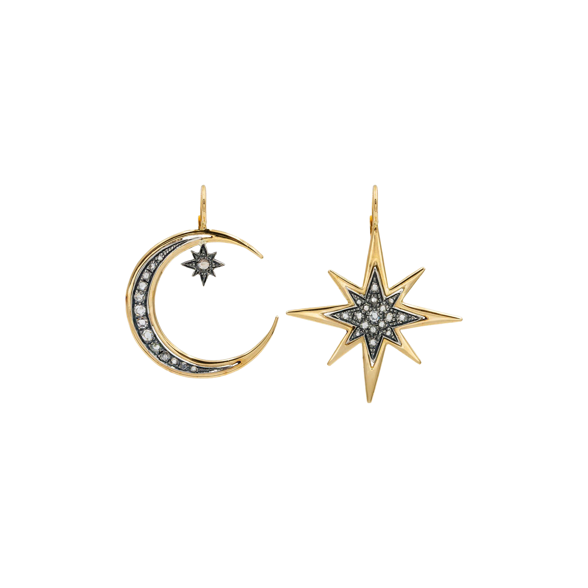 Orecchini Stella Luna Maxi Collezione Aurora in oro giallo 18ct e argento 925 brunito con Diamanti taglio Rosa Coroné ct. 0,61.