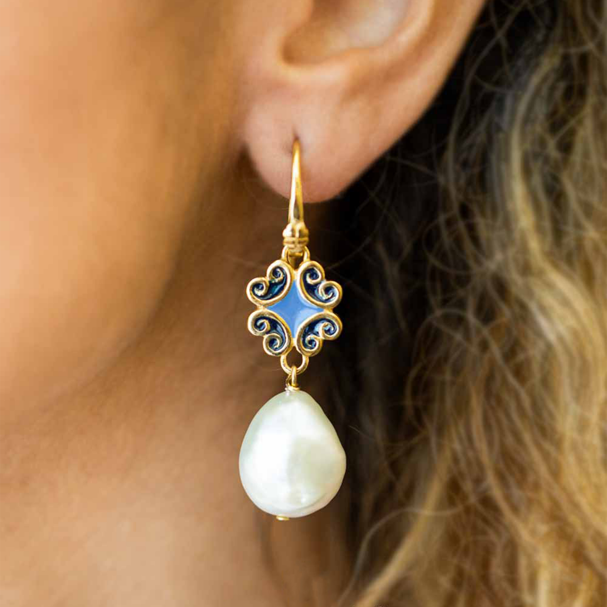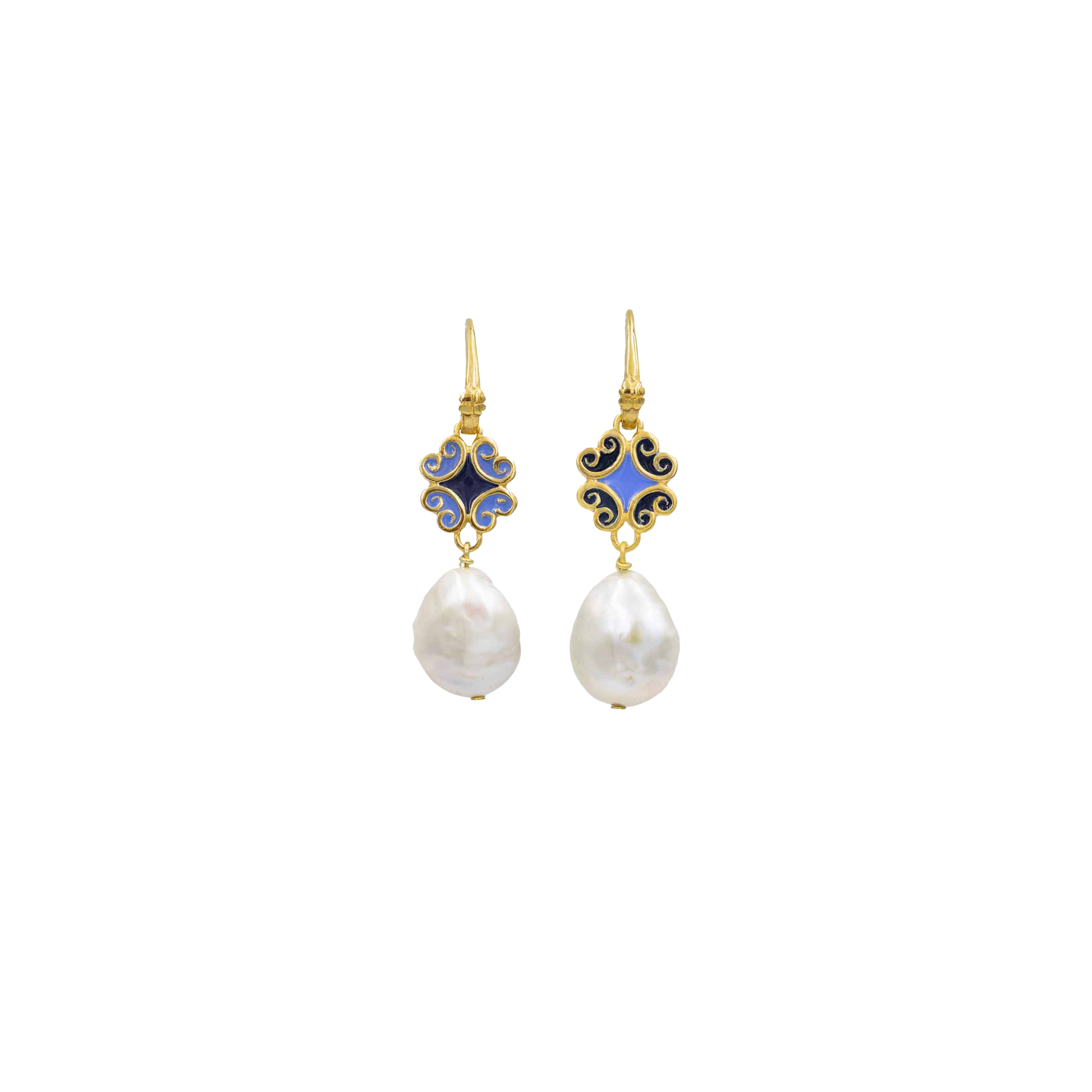 Orecchini Collezione Maioliche, in argento 925 dorato, smalti colorati e perle d’acqua dolce pendenti.