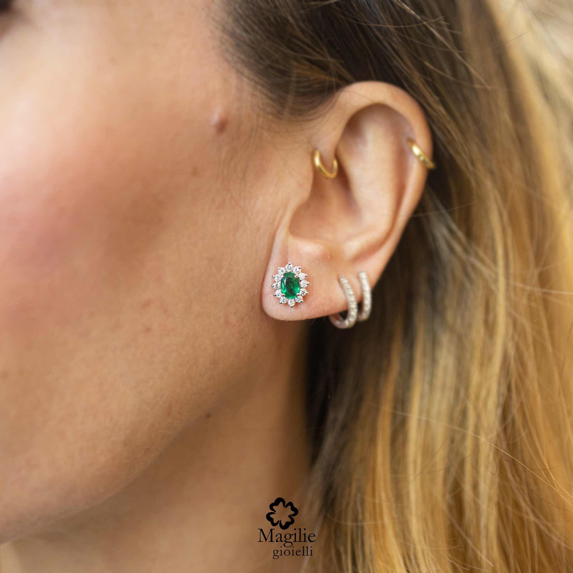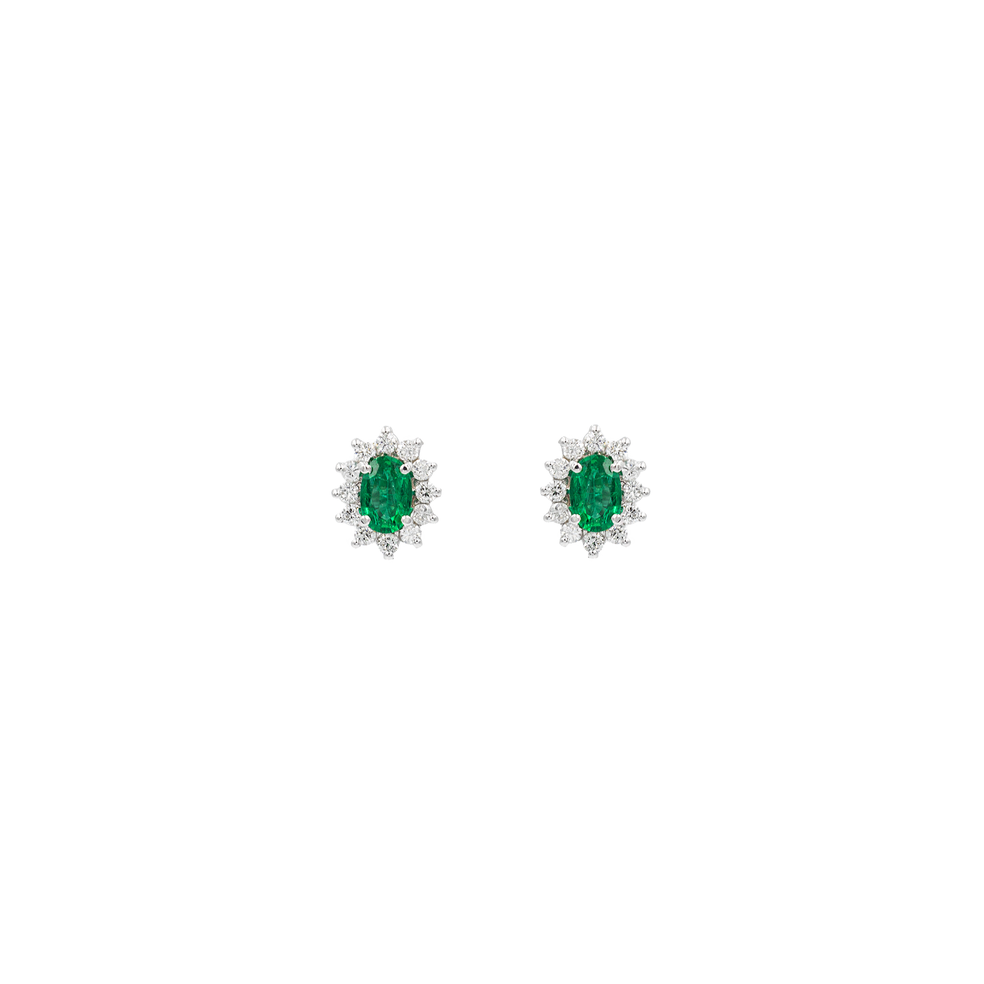 Orecchini Fleur II misura in oro bianco 18kt. con 24 Diamanti taglio brillante ct. 0,45 e Smeraldi ovali 7x5mm ct. 1,20.