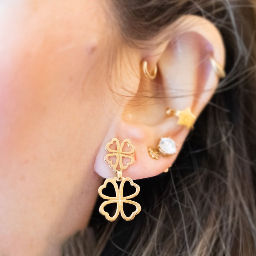 Orecchini collezione Portafortuna, quadrifoglio lobo e pendente perfilo in oro giallo 18kt