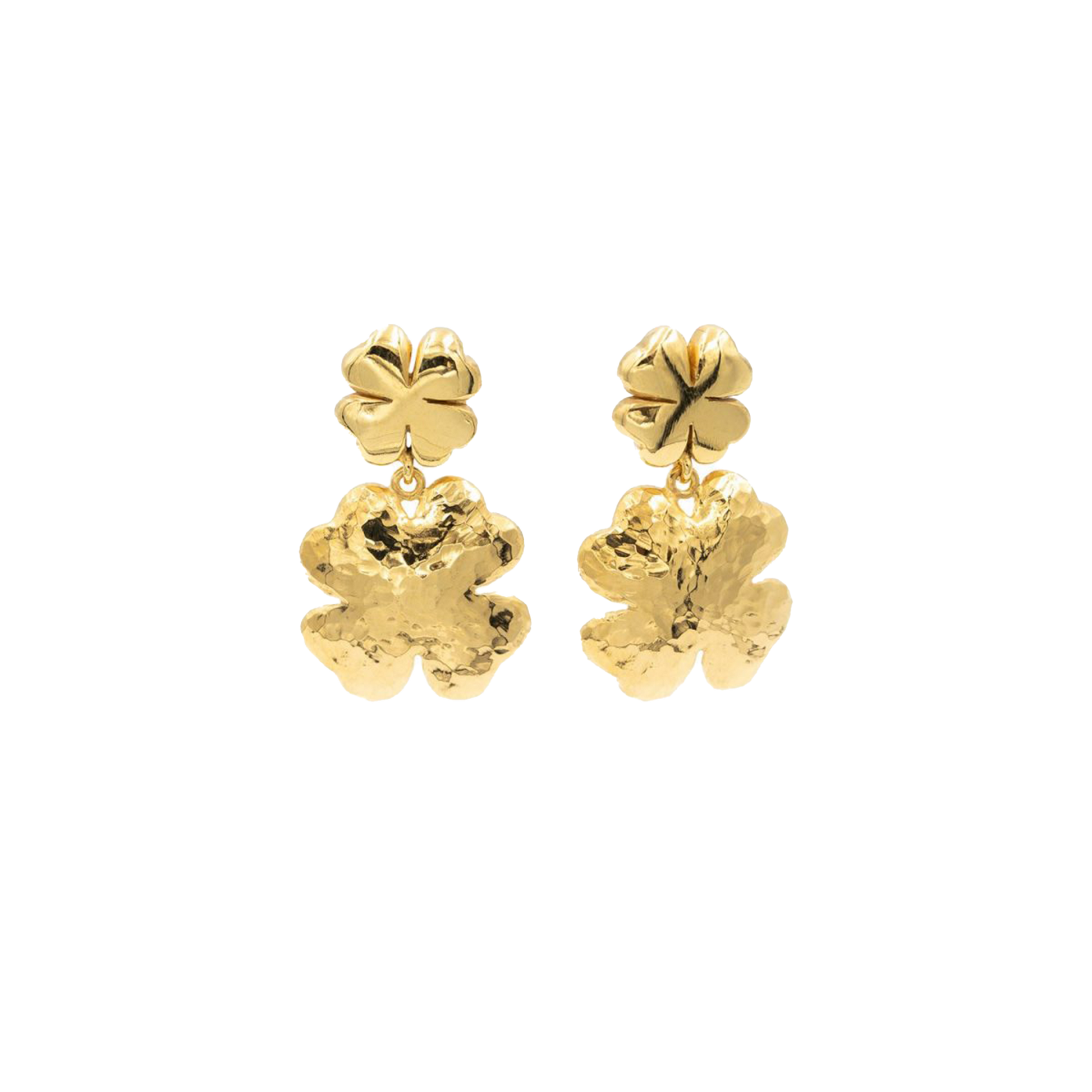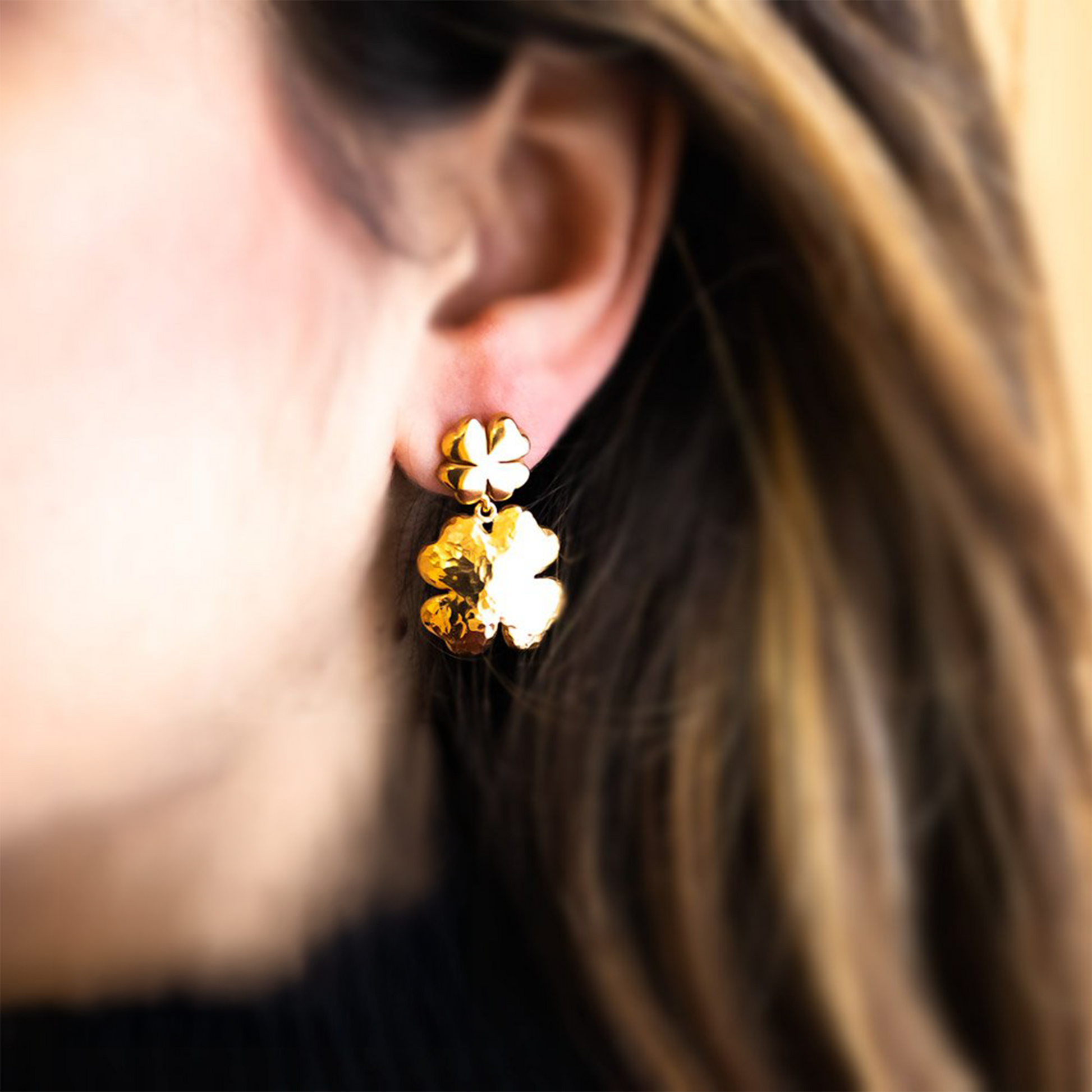 Orecchini collezione Portafortuna, quadrifoglio lobo lucido e pendente martellato in argento 925 dorato.