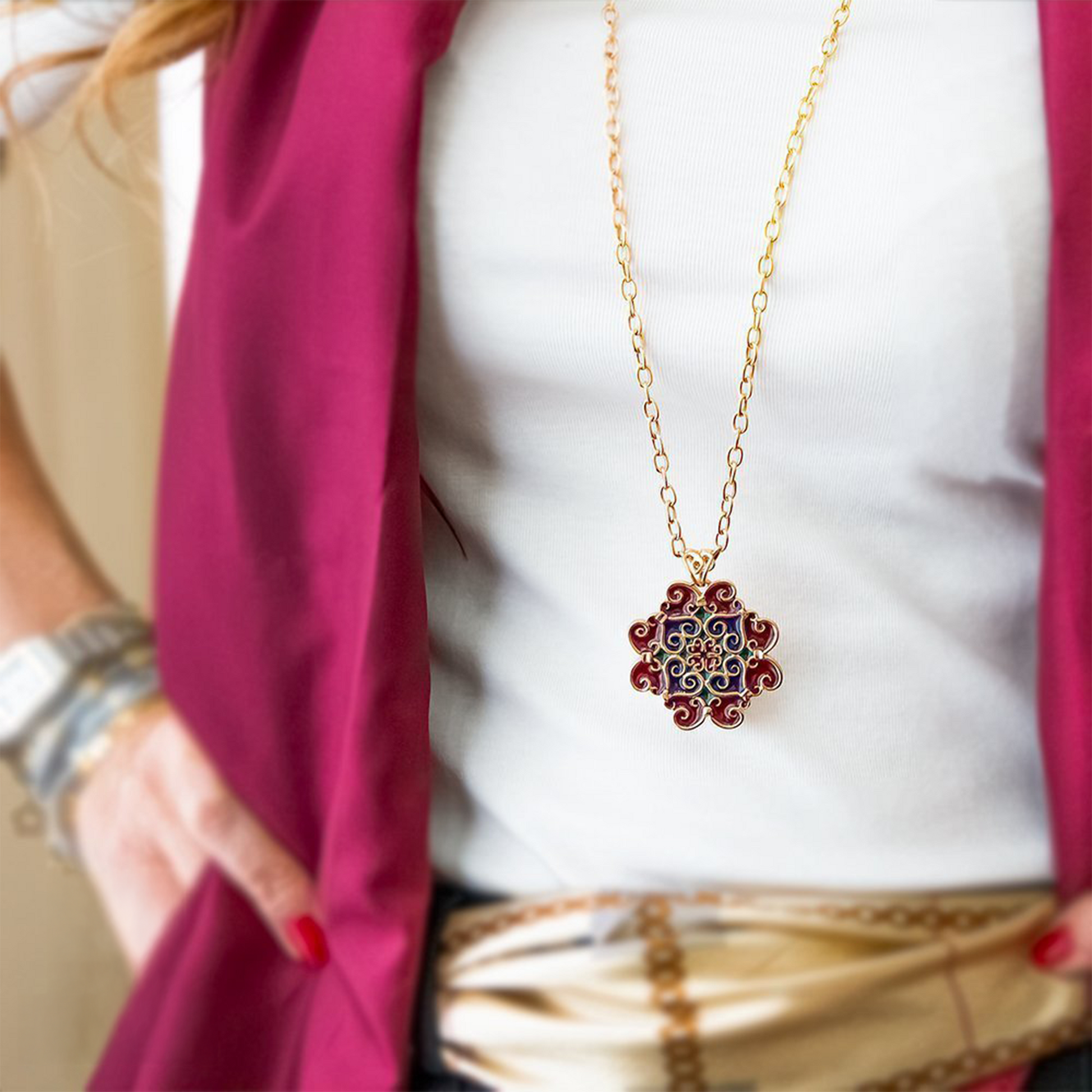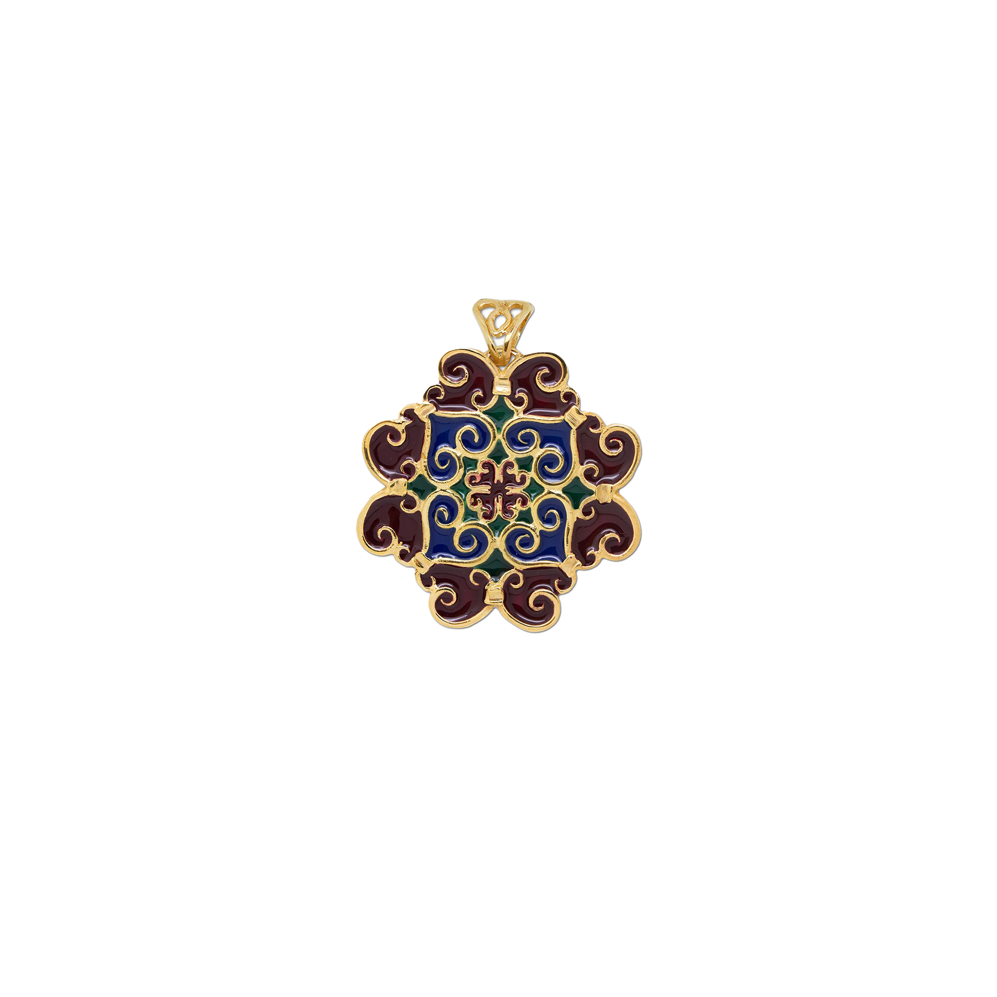 Pendente Grande Collezione Maioliche, in argento 925 dorato e smalti colorati, Bordò – Verde – Blu.