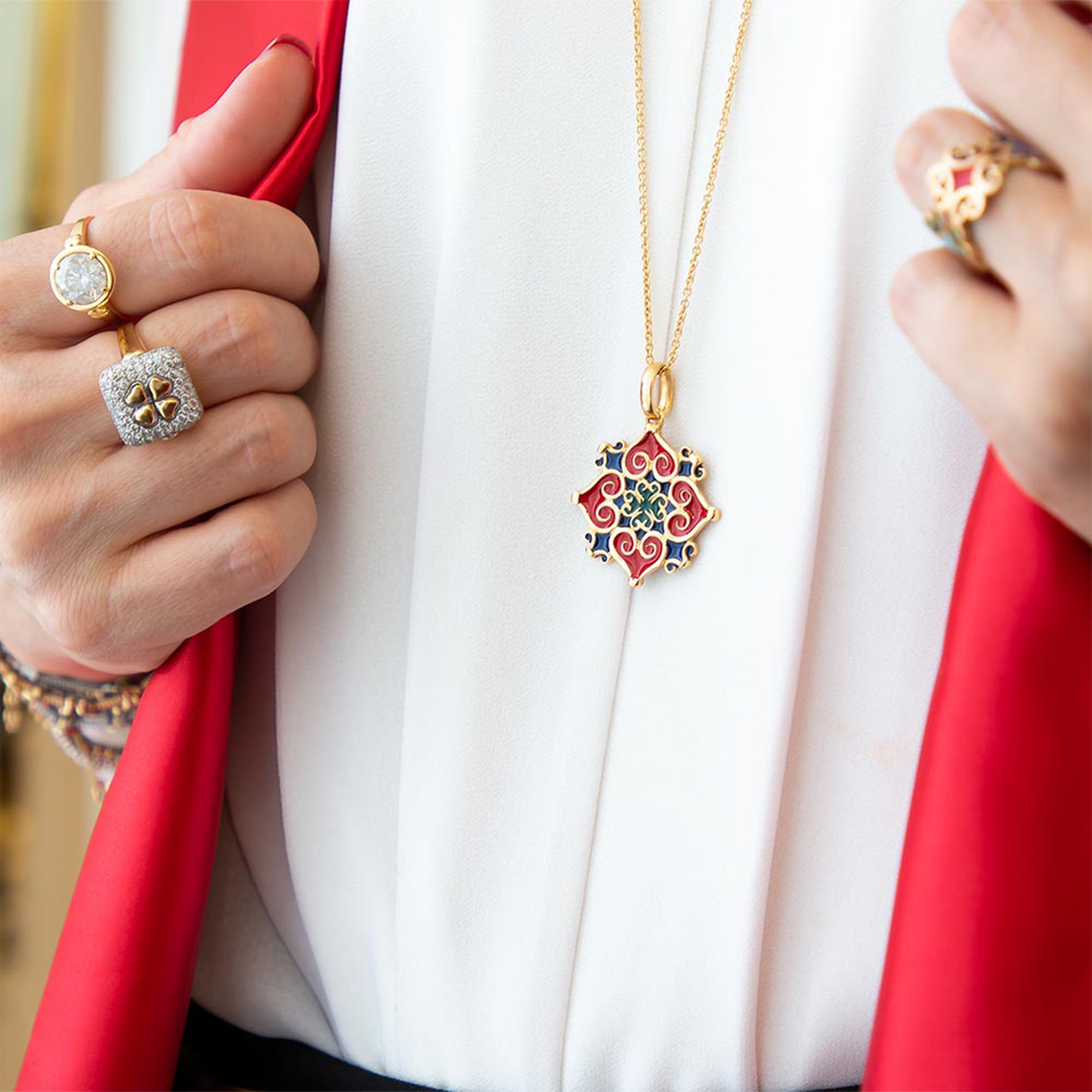 Pendente medio Collezione Maioliche, in argento 925 dorato e smalti colorati, Rosso – Verde – Blu.