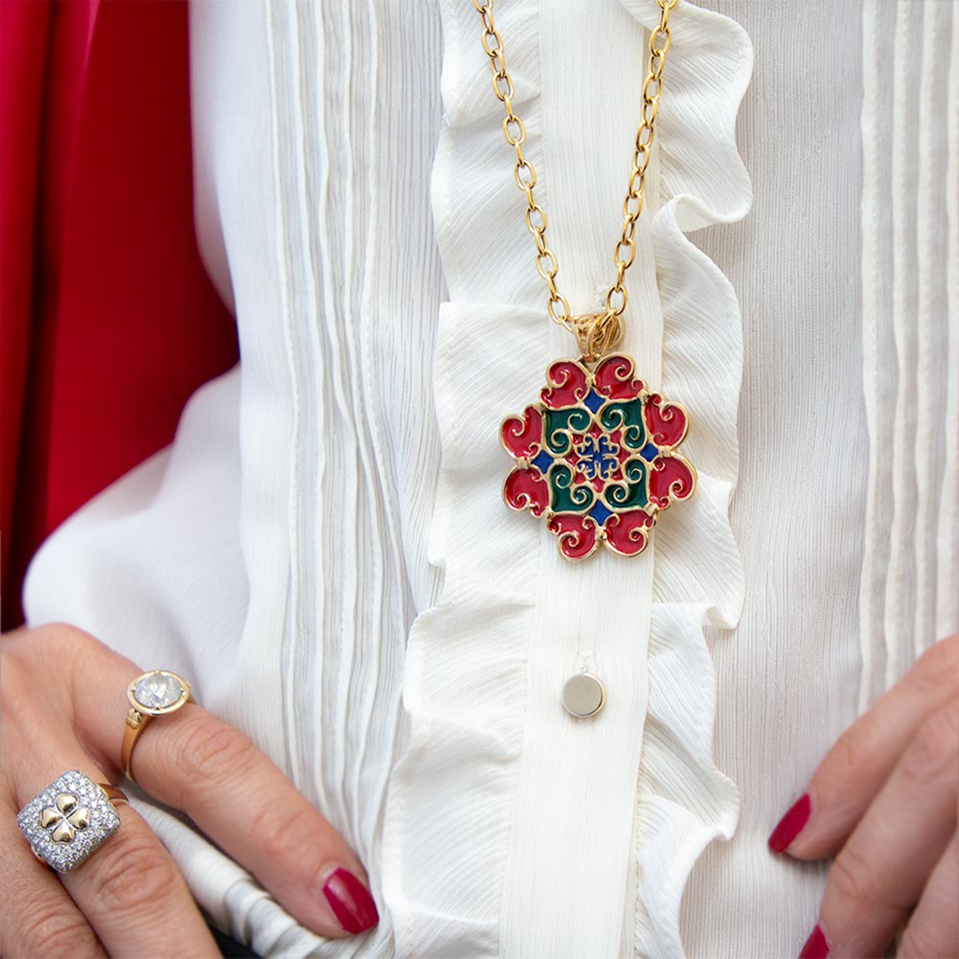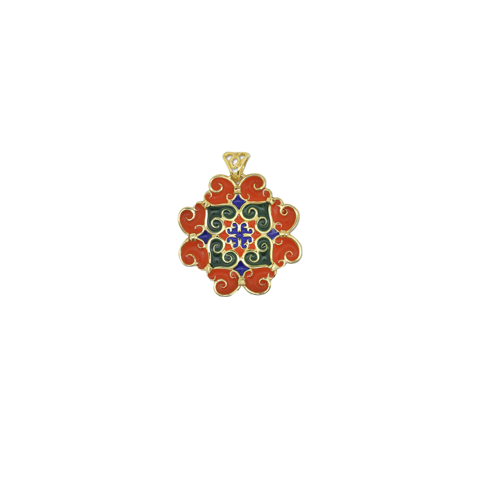 Pendente Grande Collezione Maioliche, in argento 925 dorato e smalti colorati, Rosso – Verde – Blu.