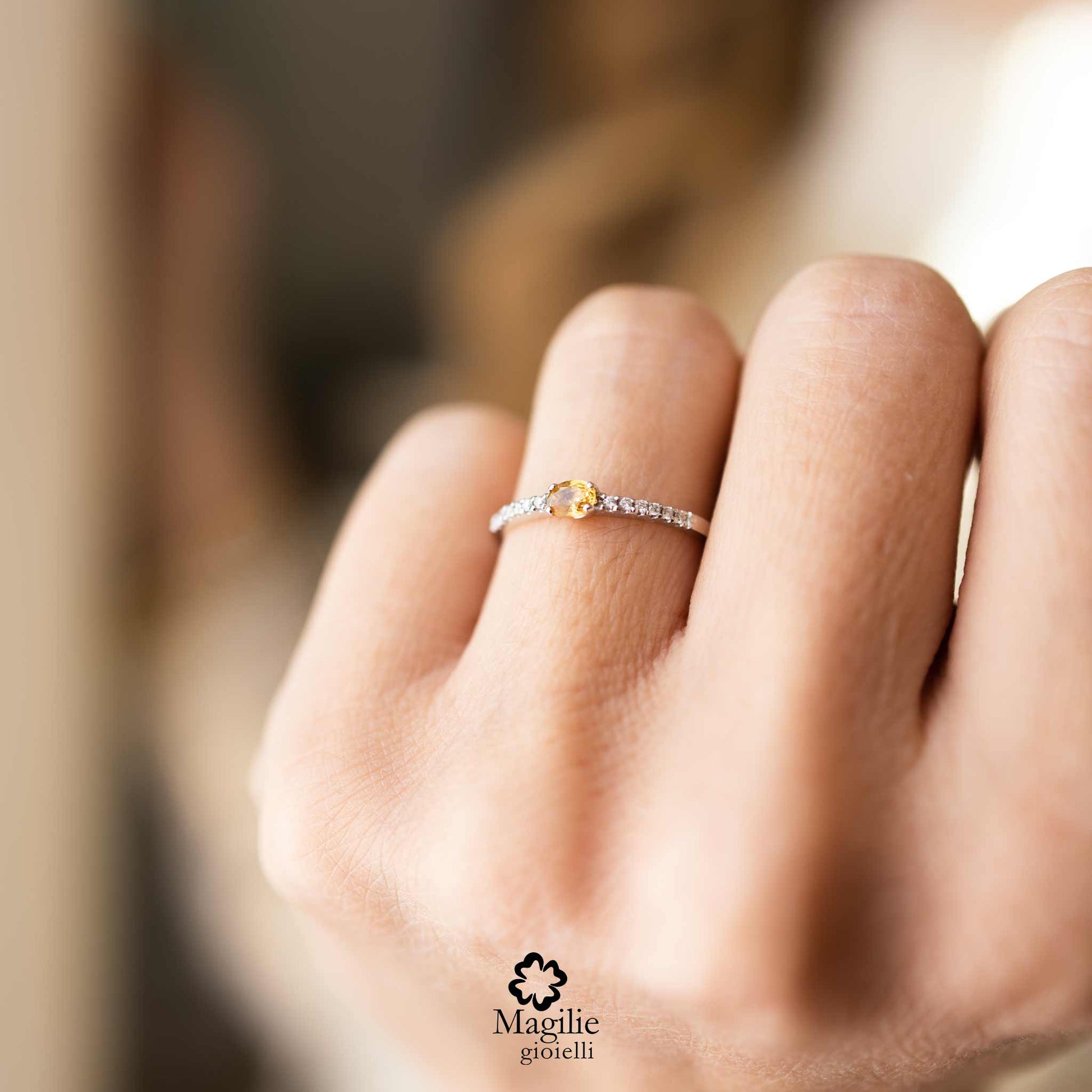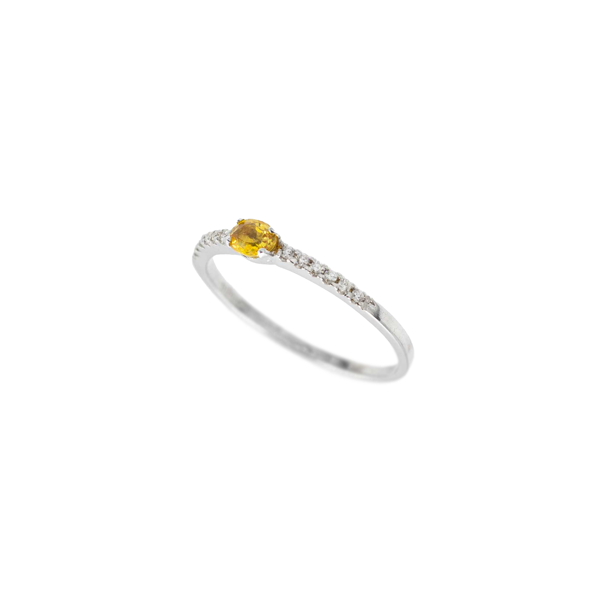 Anello Riviera Lumière in oro bianco 18kt con 12 Diamanti taglio brillante ct. 0,06 e Zaffiro Giallo.