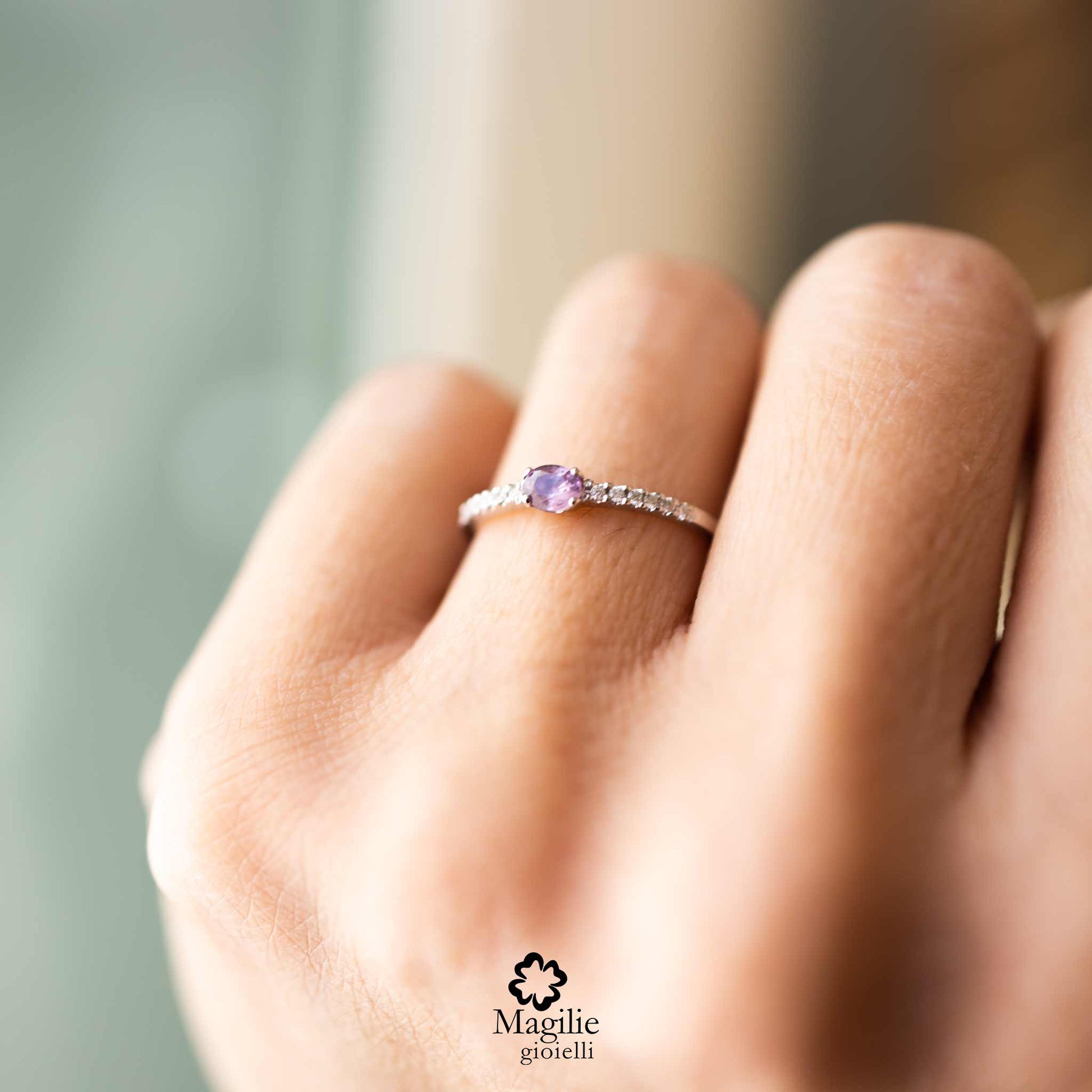 Anello Riviera Lumière in oro bianco 18kt con 12 Diamanti taglio brillante ct. 0,06 e Zaffiro Rosa.
